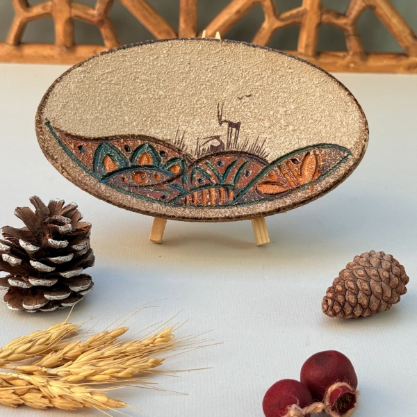 ب.مواد و تکنیک ساخت بدنه محصول : مواد اولیه ساخت سرامیک استون ور با دمای پخت ۱۱۰۰ و نقش باستانی
