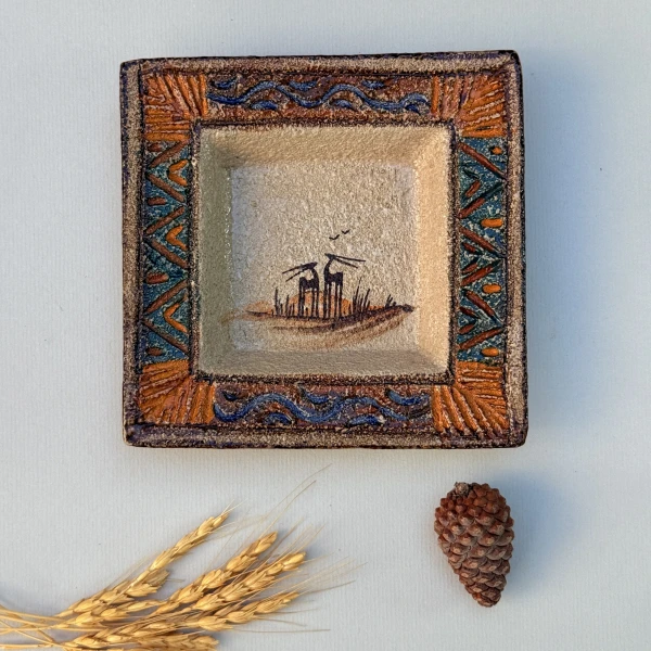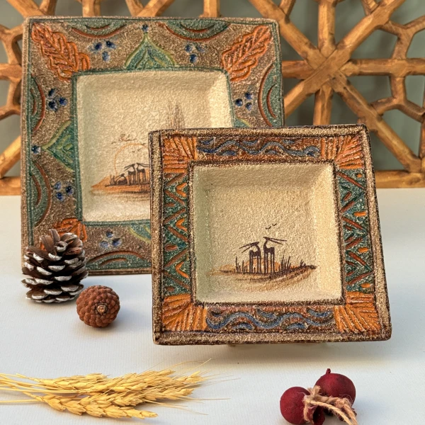 ب.مواد و تکنیک ساخت بدنه محصول : مواد اولیه ساخت سرامیک استون ور با دمای پخت ۱۱۰۰ و نقش باستانی