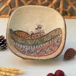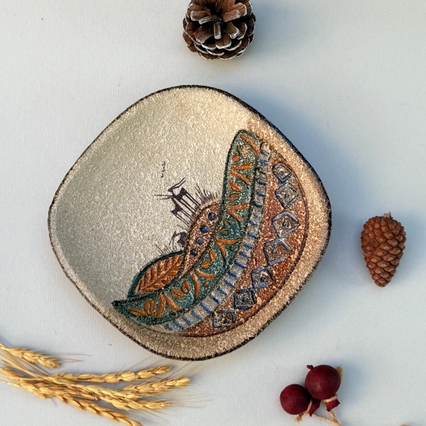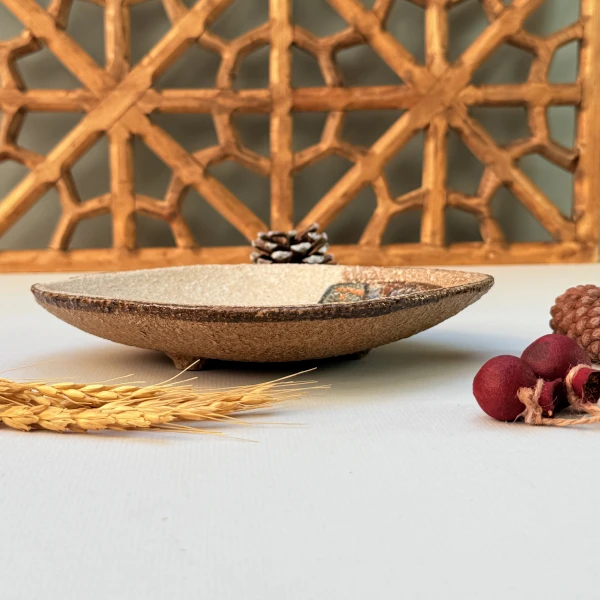 ب.مواد و تکنیک ساخت بدنه محصول : مواد اولیه ساخت سرامیک استون ور با دمای پخت ۱۱۰۰ و نقش باستانی