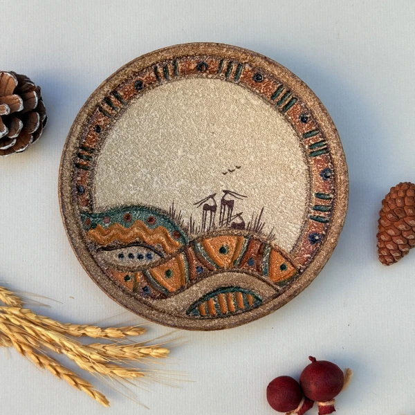 ب.مواد و تکنیک ساخت بدنه محصول : مواد اولیه ساخت سرامیک استون ور با دمای پخت ۱۱۰۰ و نقش باستانی