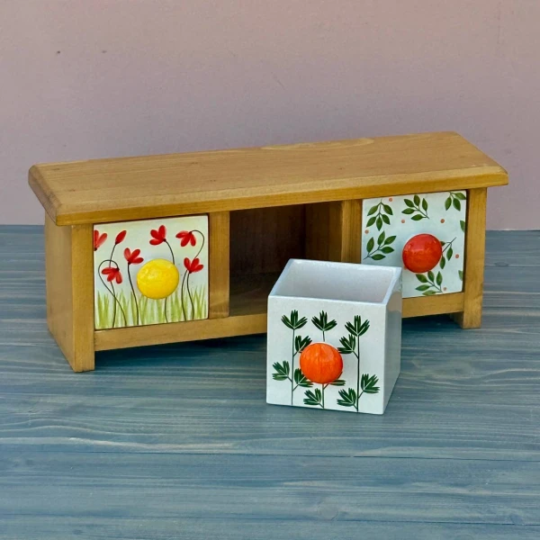 ب.مواد و تکنیک ساخت : قاب محصول چوب روس و راش با تکنیک های نجاری و خراطی و کشو های محصول به وسیله مواد اولیه تولید سرامیک با دمای پخت ۱۰۰۰ درجه می باشد.
