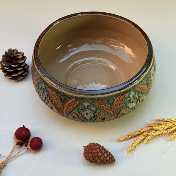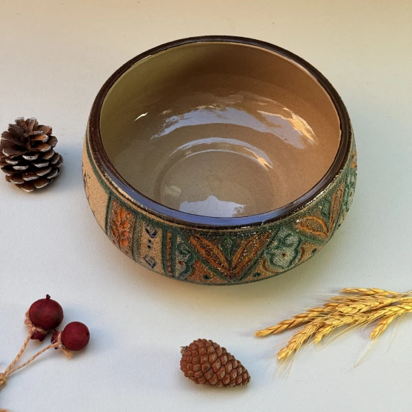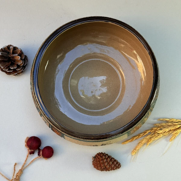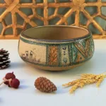 ب.مواد و تکنیک ساخت بدنه محصول : مواد اولیه ساخت سرامیک استون ور با دمای پخت ۱۱۰۰ و نقوش باستانی
