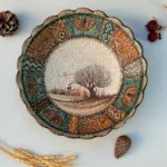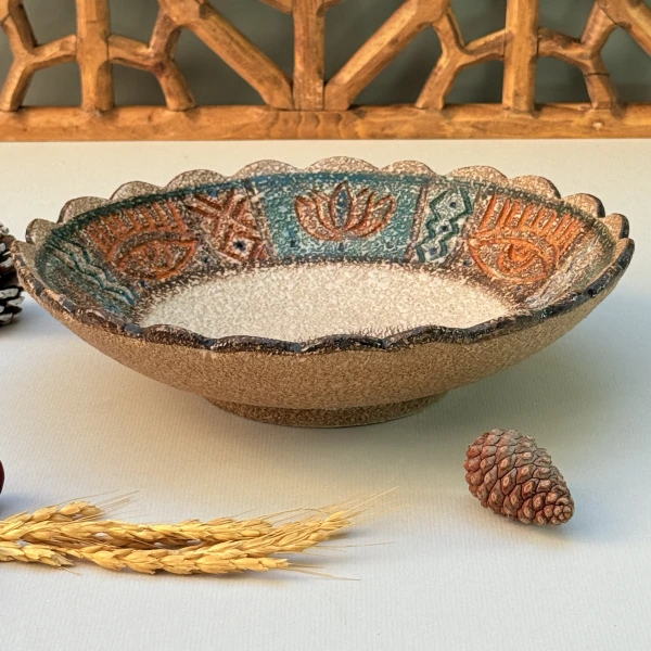 ب.مواد و تکنیک ساخت بدنه محصول : مواد اولیه ساخت سرامیک استون ور با دمای پخت ۱۱۰۰ و نقش باستانی